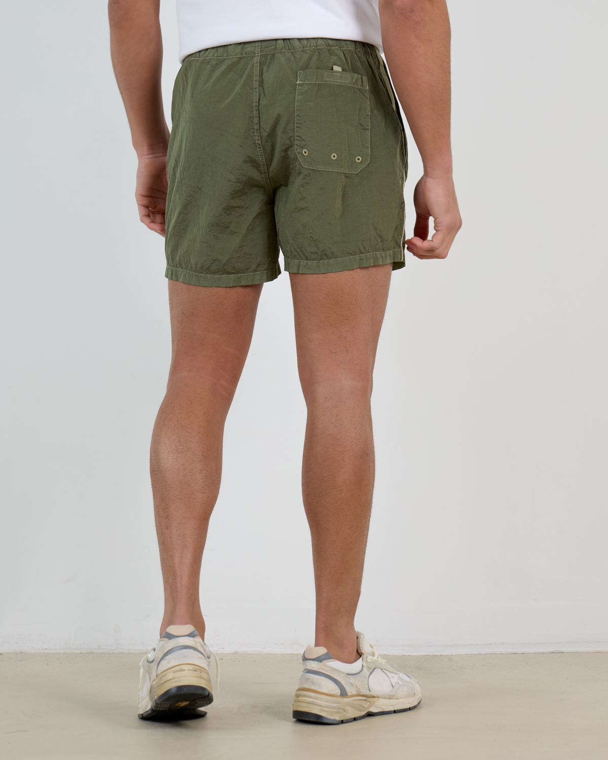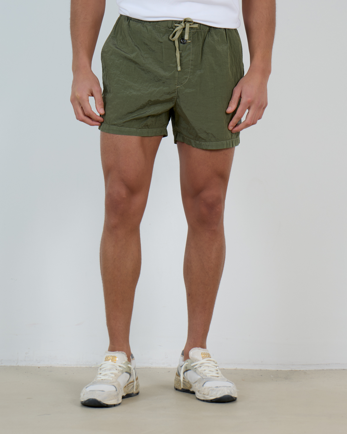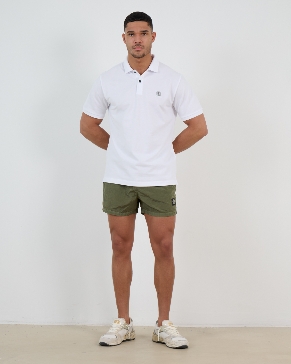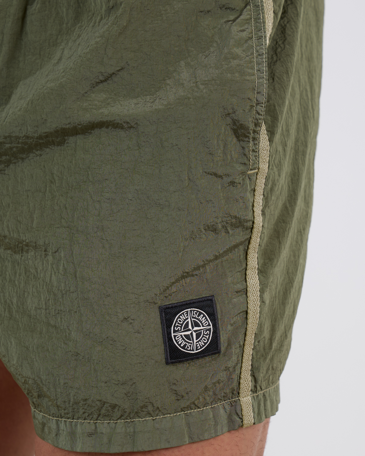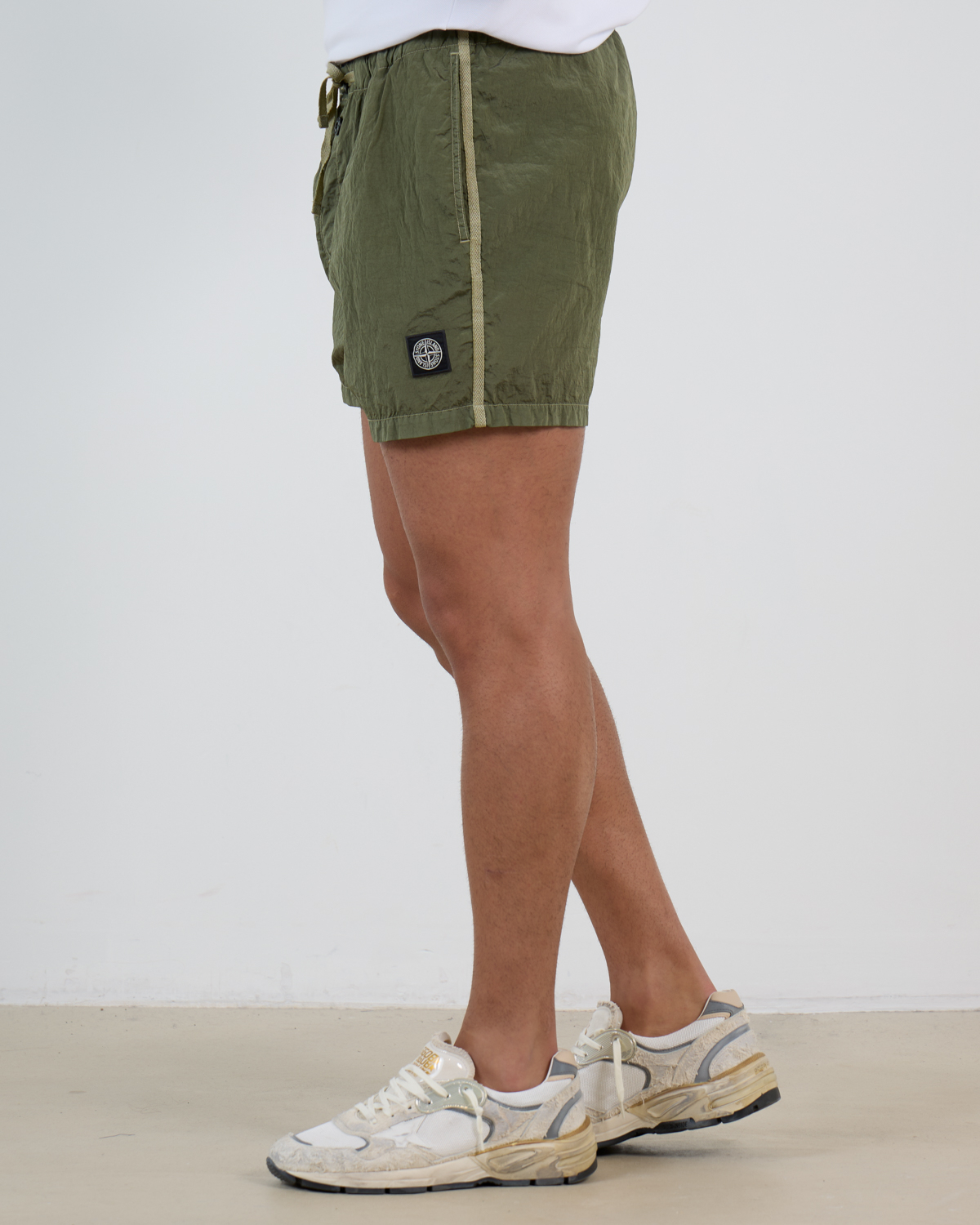 This military green swim short brings refined style to your swimwear collection. Crafted from 100% polyamide, the lightweight fabric dries quickly and moves comfortably with you. The slim fit silhouette creates a modern look, while the adjustable drawstring waist ensures optimal comfort. The classic green shade features contrasting tape details and the signature Stone Island compass logo on the leg. Two practical pockets and clean turned-up hem complete this sophisticated men's clothing piece.