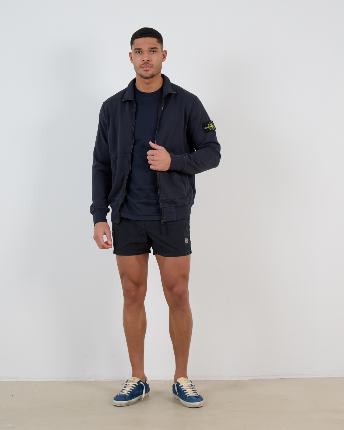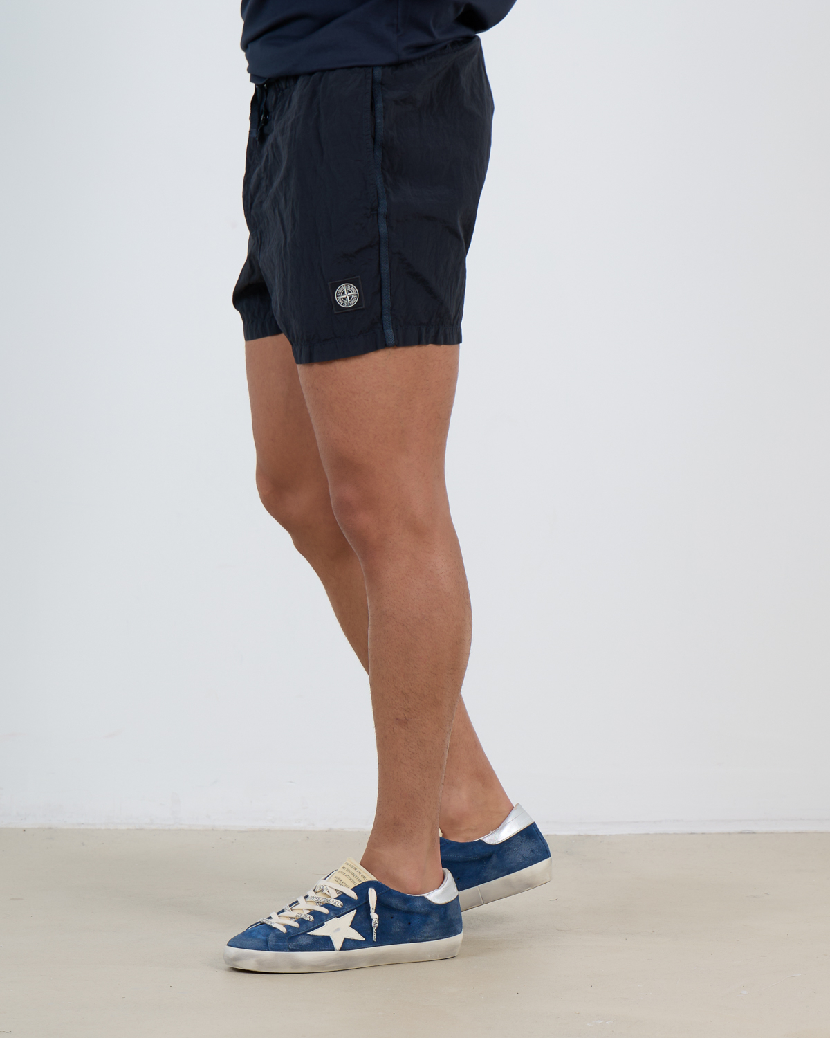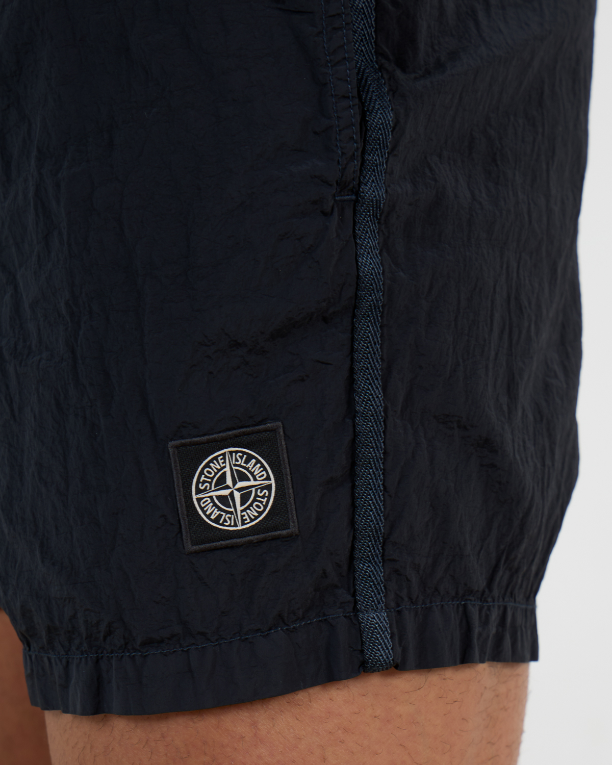 These navy blue swim shorts combine refined style with practical functionality for modern men's clothing. Crafted from 100% polyamide, the lightweight fabric offers quick-drying properties and comfortable stretch. The slim fit creates a tailored silhouette while maintaining freedom of movement. An adjustable drawstring waistband ensures optimal fit, while the distinctive Stone Island compass logo adds sophisticated brand recognition to the side.