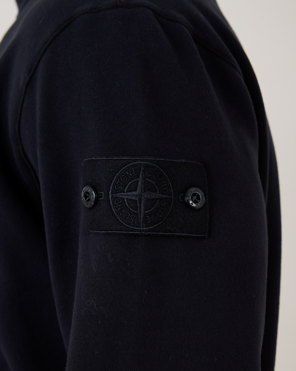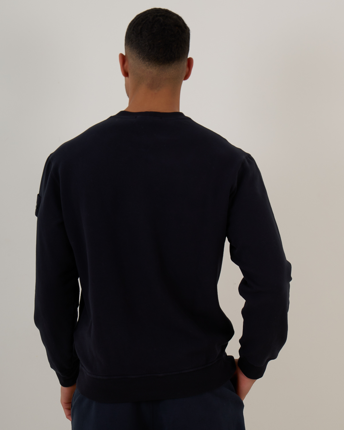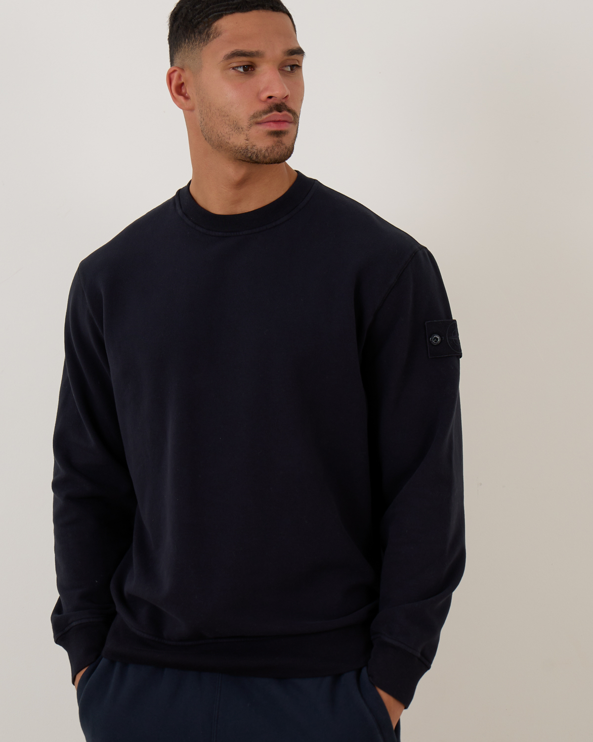 This navy crewneck sweater from Stone Island combines refined comfort with contemporary men's clothing design. Crafted from a premium cotton blend of 95% cotton and 5% elastane, the fabric offers natural breathability with subtle stretch for enhanced movement. The regular fit provides a classic silhouette that flatters without restriction. The iconic Stone Island compass badge adorns the left sleeve, featuring tonal navy embroidery with contrasting button details that showcase the brand's distinctive craftsmanship.