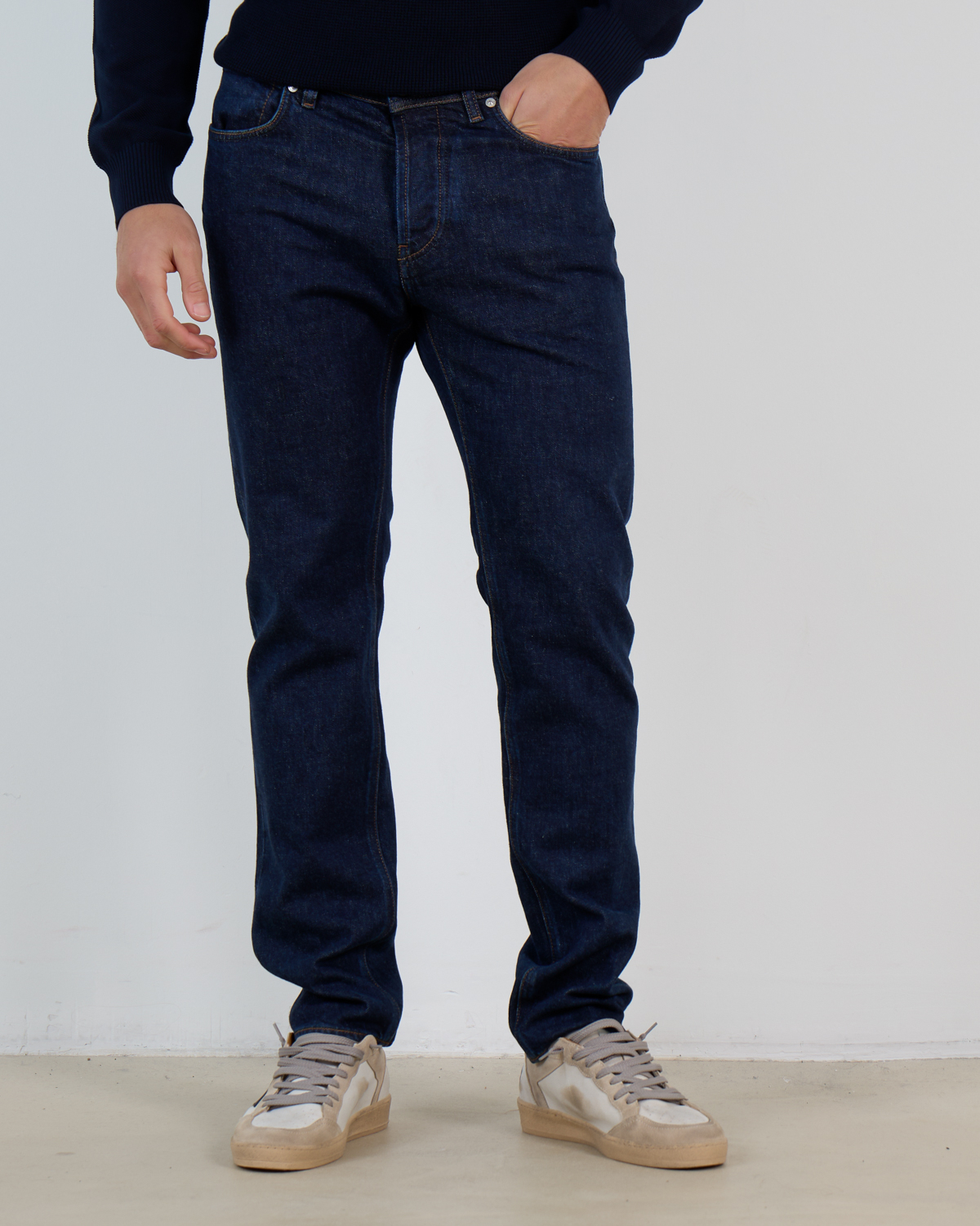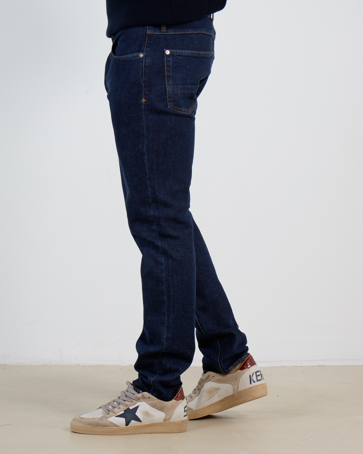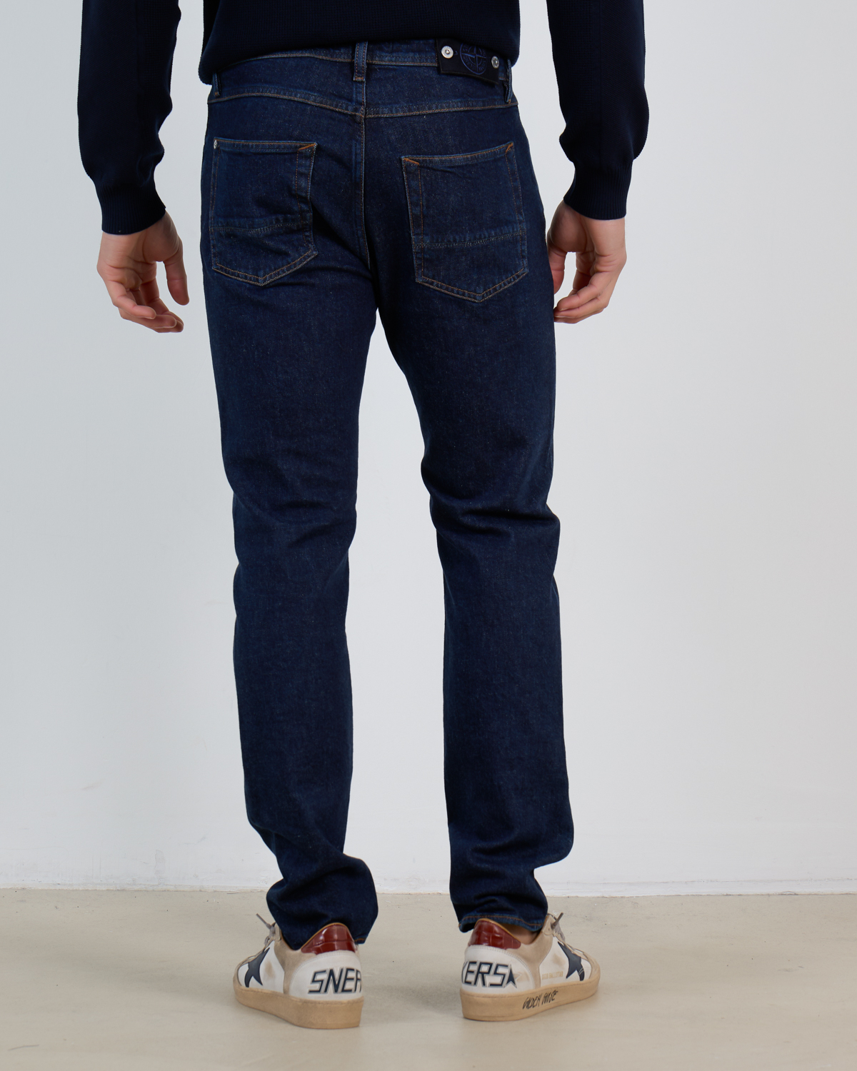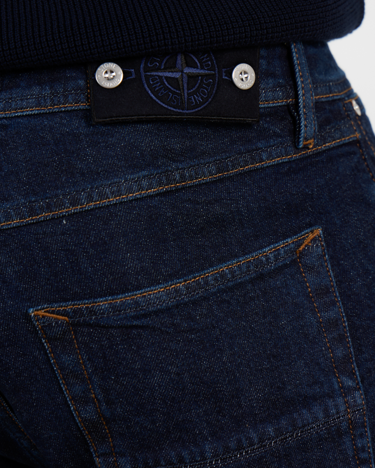 These blue rinse stretch jeans by Stone Island combine classic denim styling with modern comfort. The deep blue wash creates a refined look, while the 98% cotton and 2% elastane blend offers flexibility throughout your day. The slim fit silhouette ensures a tailored appearance with classic five-pocket styling, button fly closure, and contrast stitching details that define the contemporary men's clothing aesthetic.