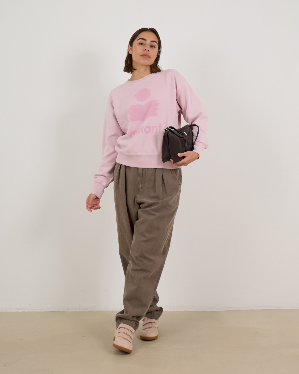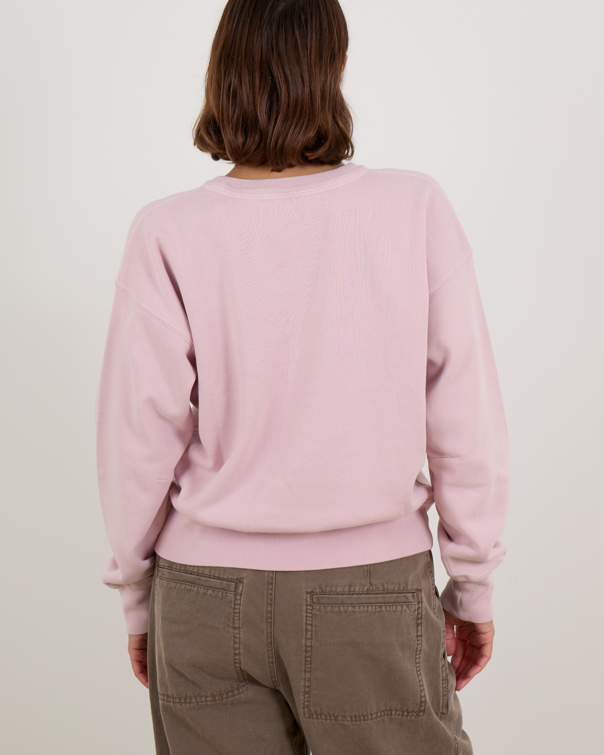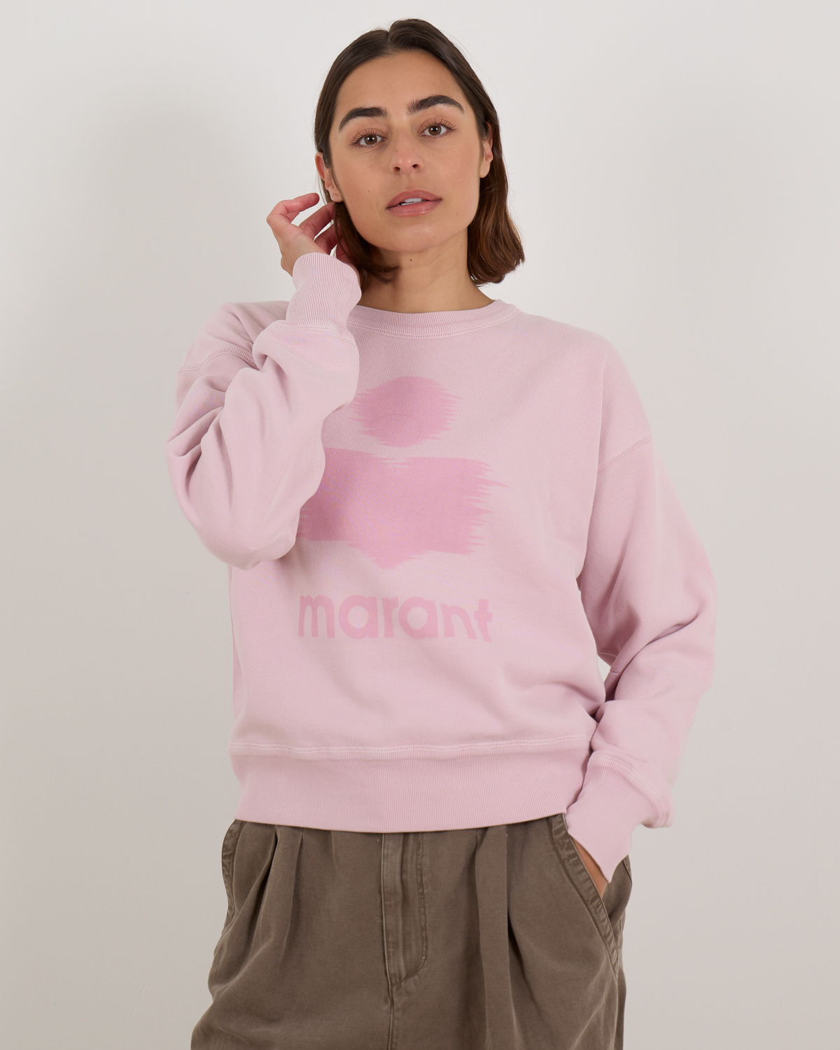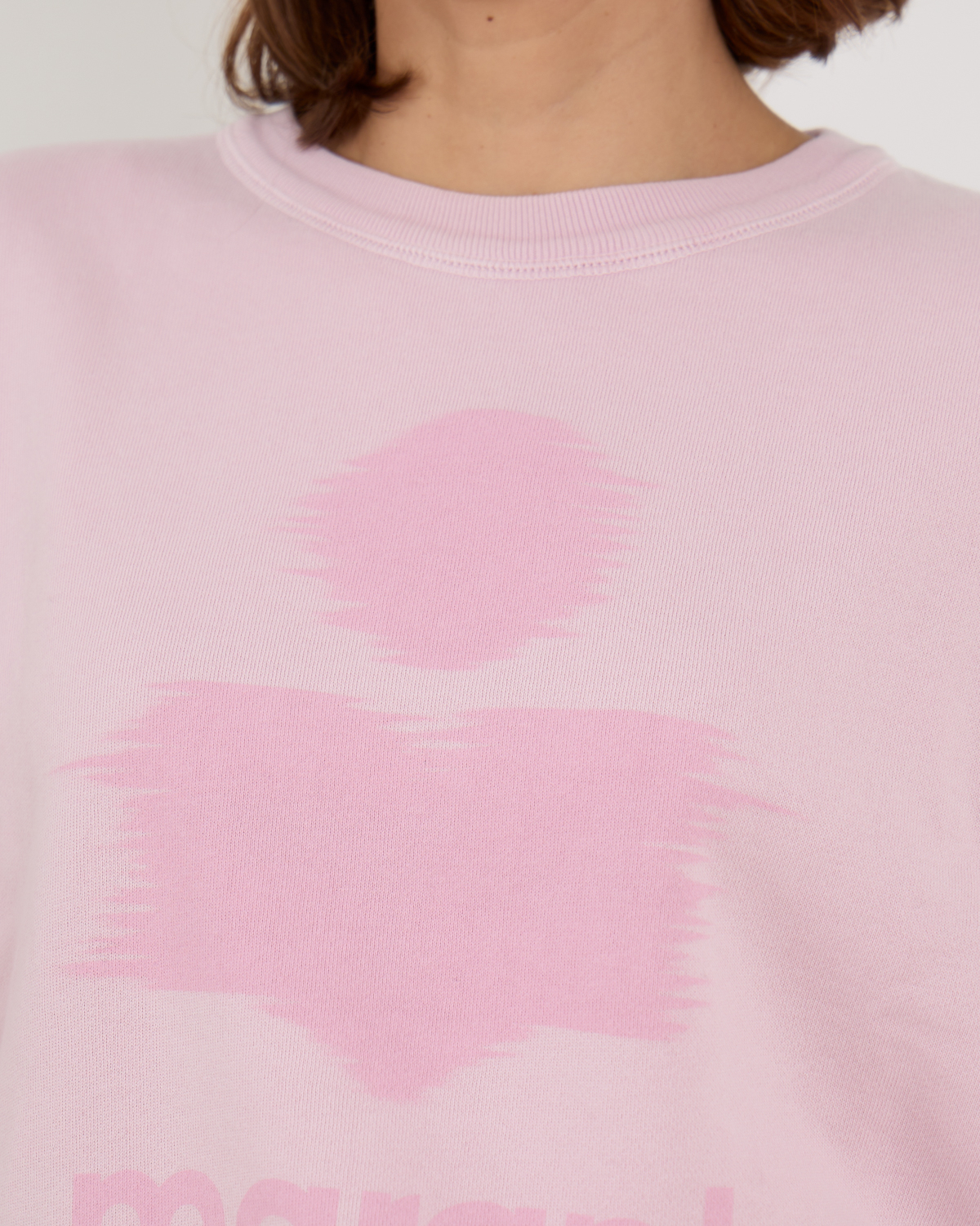 This pink sweater from Marant Étoile features a striking logo print across the front in tonal pink shades. The women's clothing piece is crafted from a soft cotton-polyester blend (88% cotton, 12% polyester) with long sleeves and ribbed details at the neckline, cuffs, and hem. The regular fit silhouette offers comfortable wear while maintaining a contemporary aesthetic.