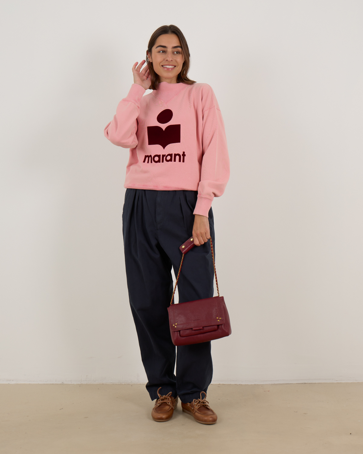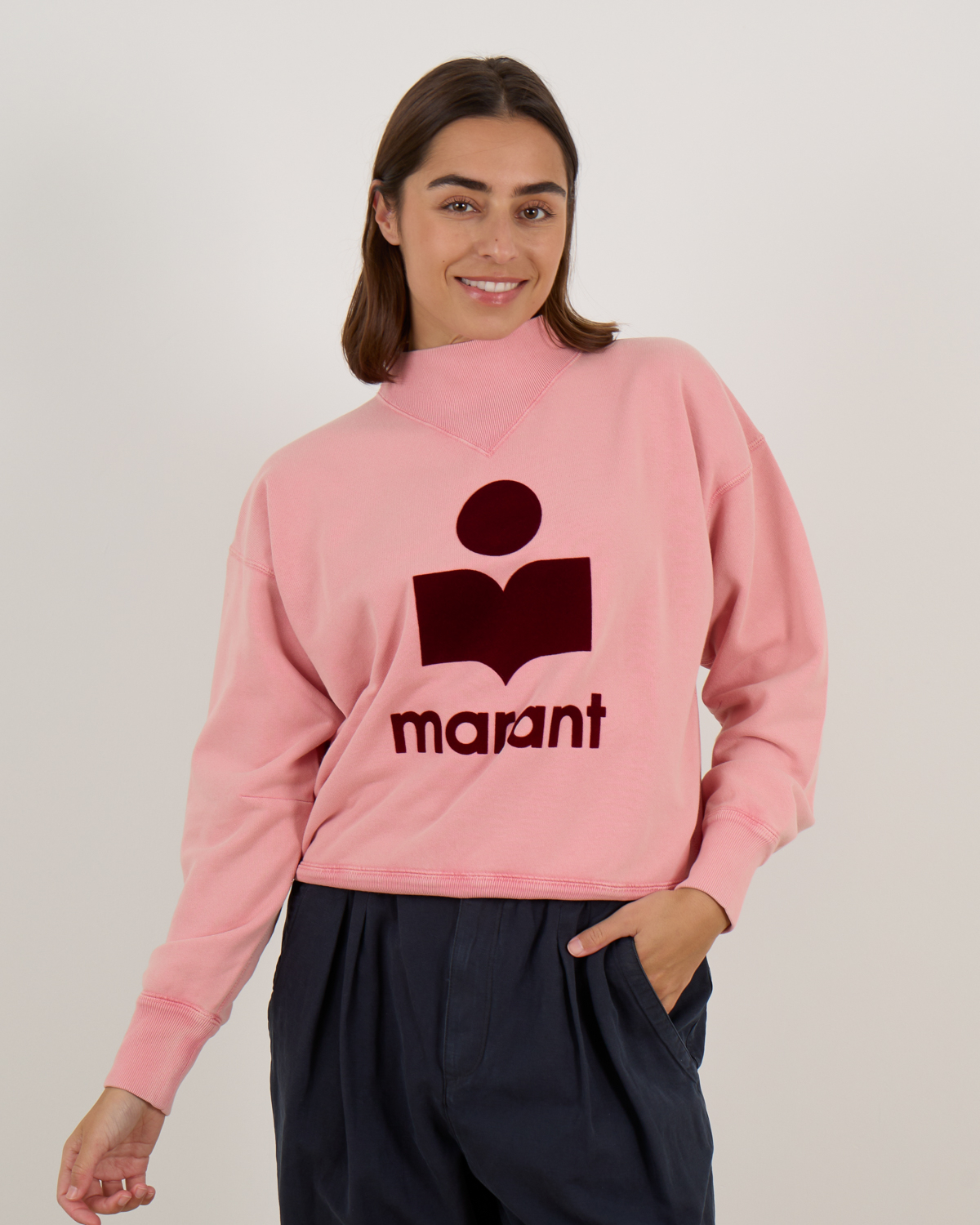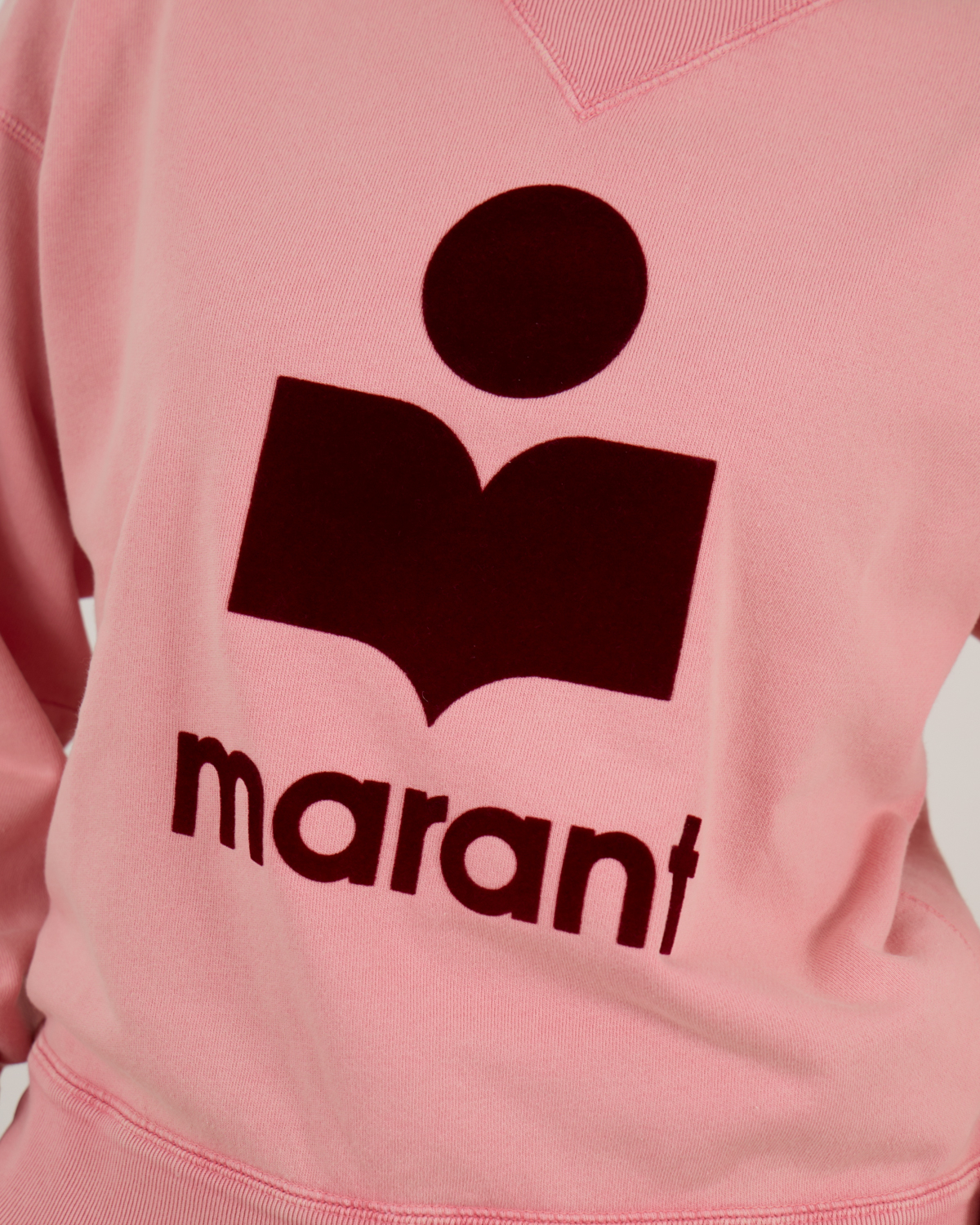 This pink logo sweatshirt showcases contemporary women's clothing at its finest. The soft cotton-polyester blend (88% cotton, 12% polyester) creates a luxurious feel while the relaxed fit provides comfortable all-day wear. The striking burgundy Marant logo takes center stage, featuring the iconic geometric design that makes this piece instantly recognizable. Ribbed detailing at the collar, cuffs, and hem adds refined structure to the relaxed silhouette.
