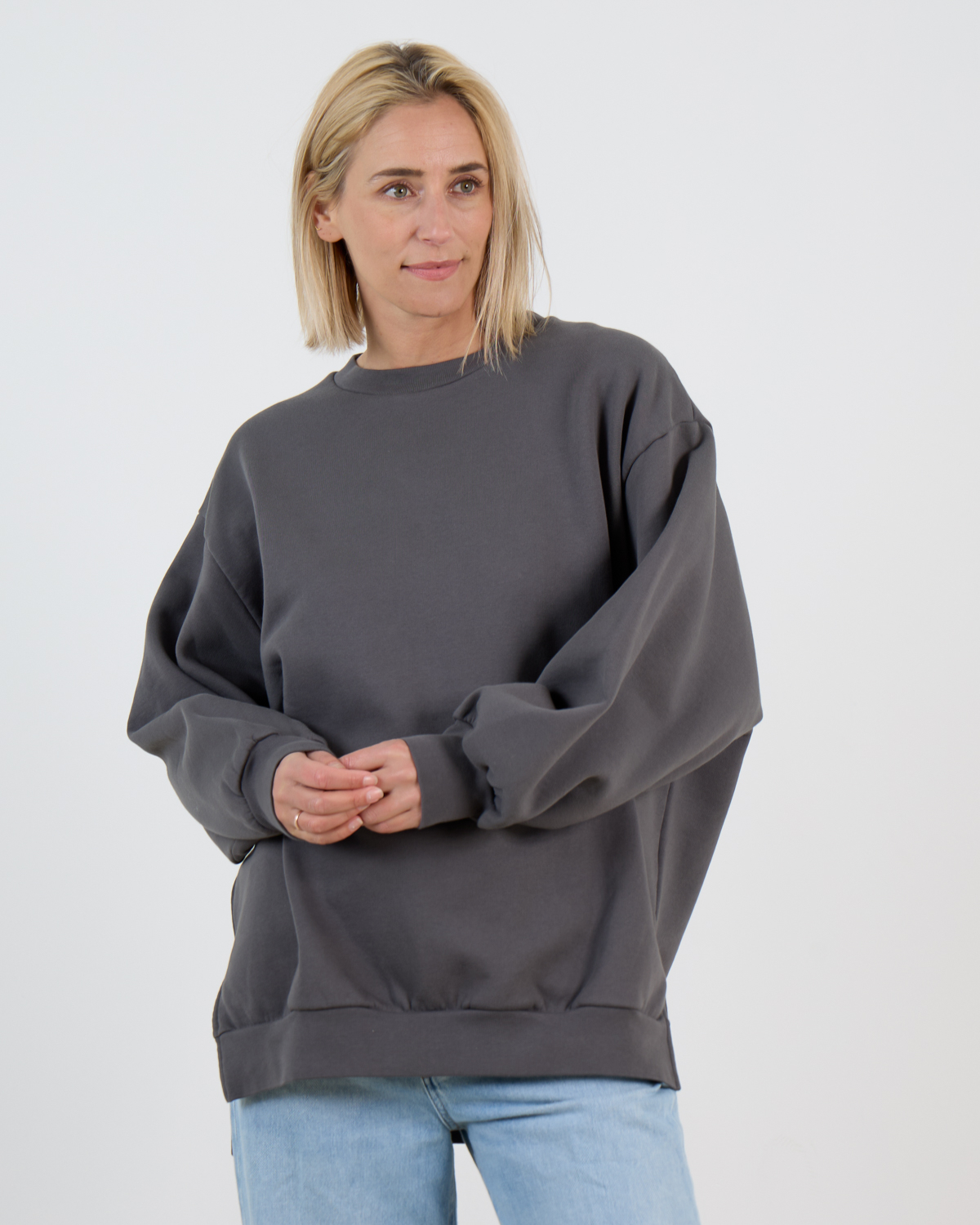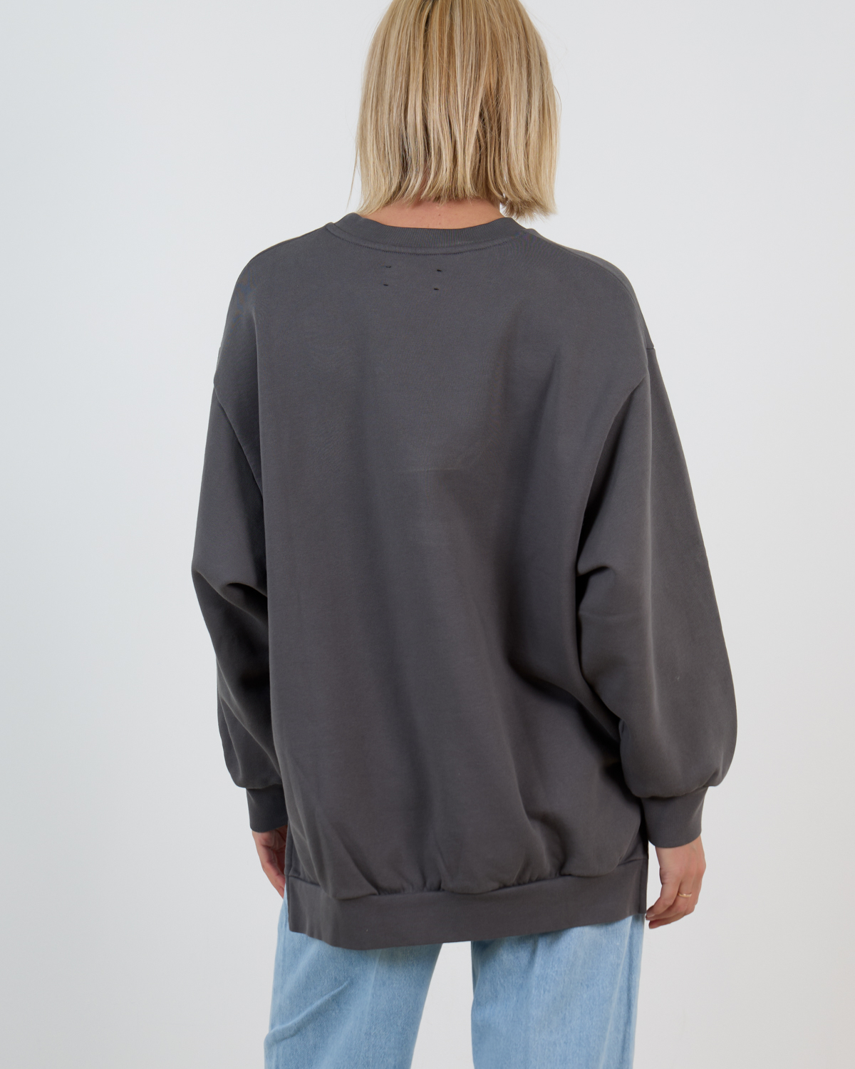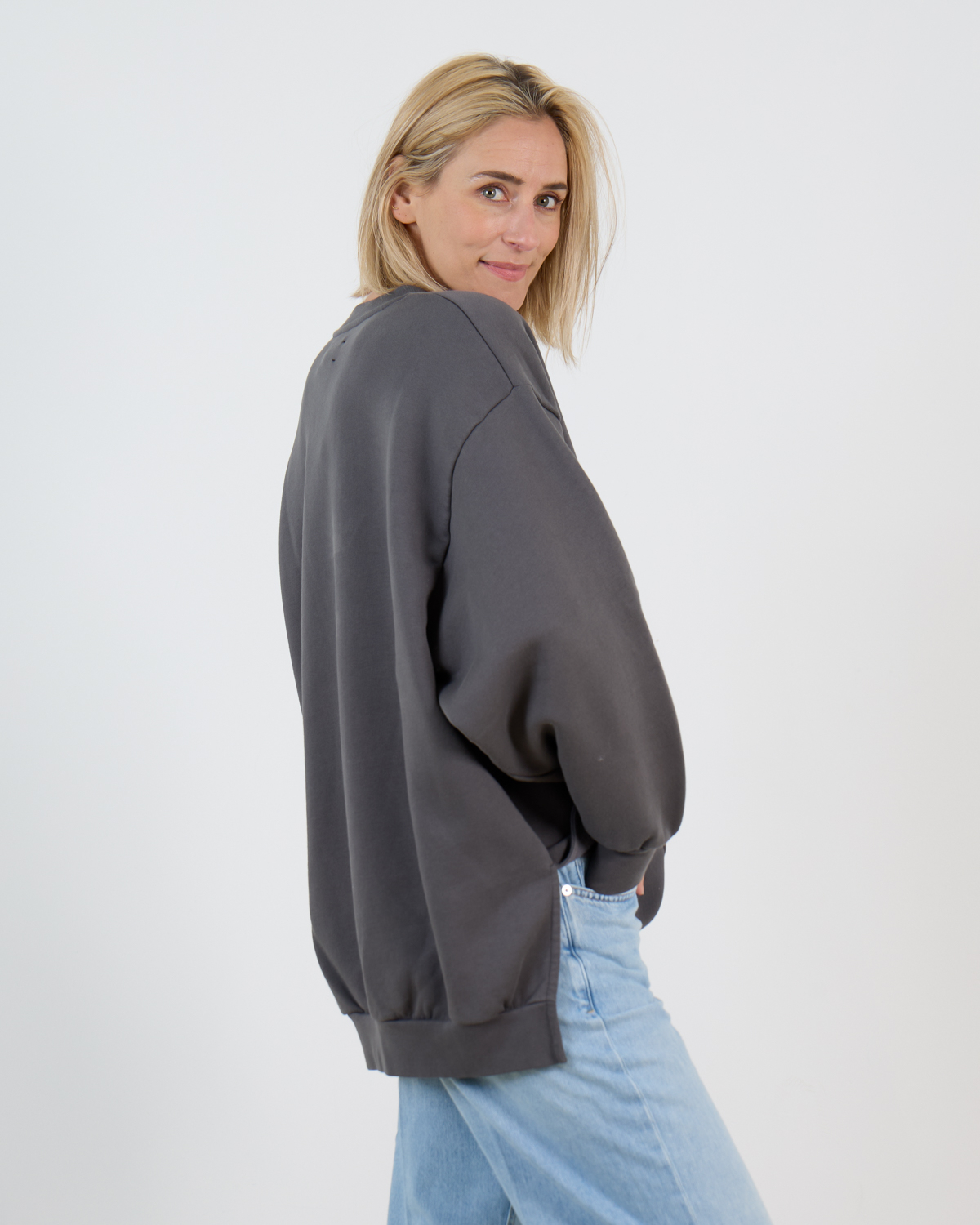 This anthracite crewneck sweater combines comfort with contemporary style. The oversized fit creates a relaxed silhouette, while the classic crew neckline and ribbed cuffs add refined details. Crafted from a premium cotton-polyester blend (80% cotton, 20% polyester), this women's clothing piece offers both softness and durability. The long sleeves and subtle distressed details on the back elevate this essential pullover from Ame Antwerp.