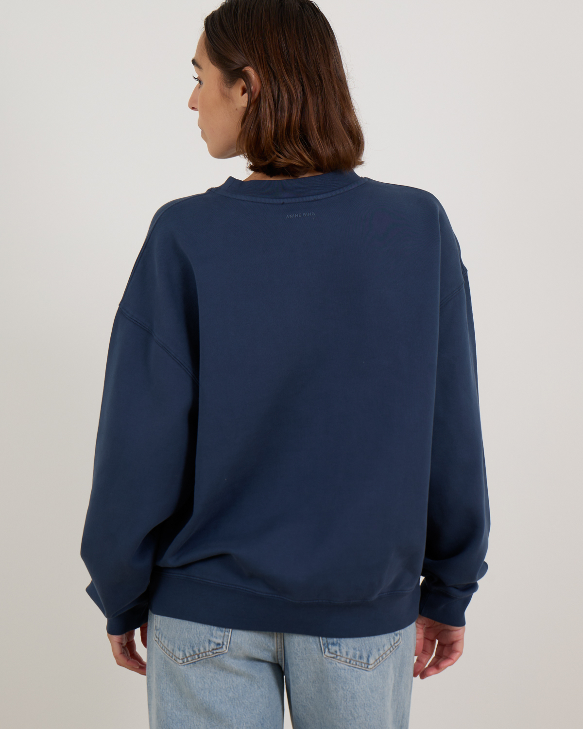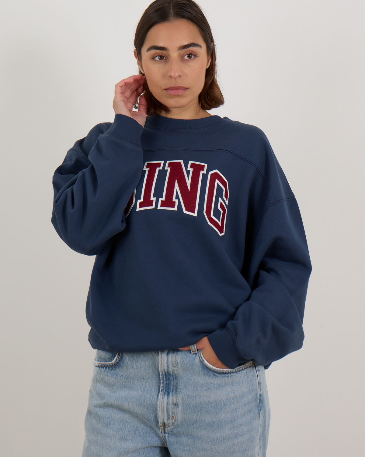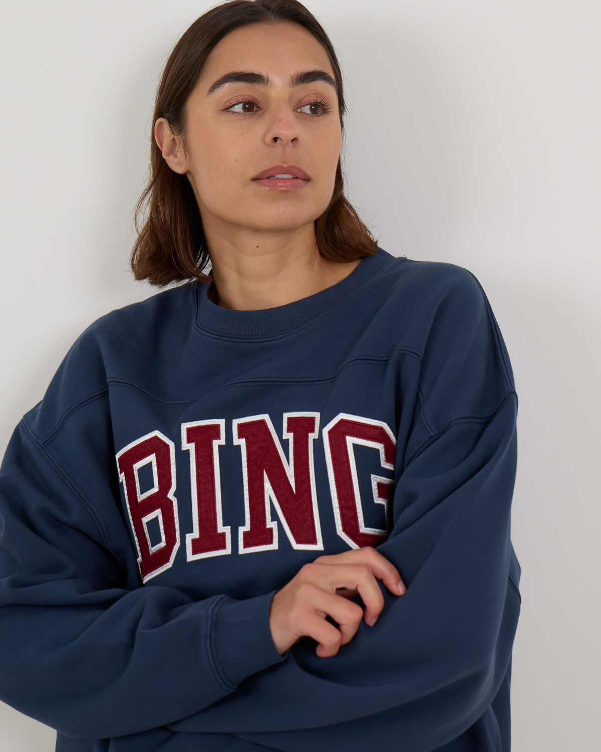 This navy blue crewneck sweater from Anine Bing brings collegiate charm to your women's clothing collection. The bold "BING" lettering in burgundy and white creates a striking statement piece. Crafted from 100% cotton, this long-sleeved sweater features a classic crew neckline and relaxed loose-fitting silhouette. The premium cotton construction ensures comfort while the collegiate-inspired design adds a playful twist to contemporary fashion.