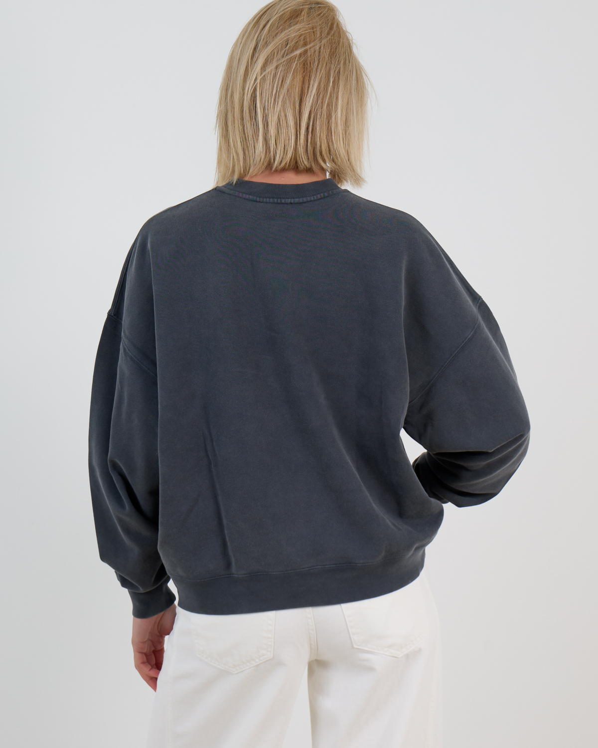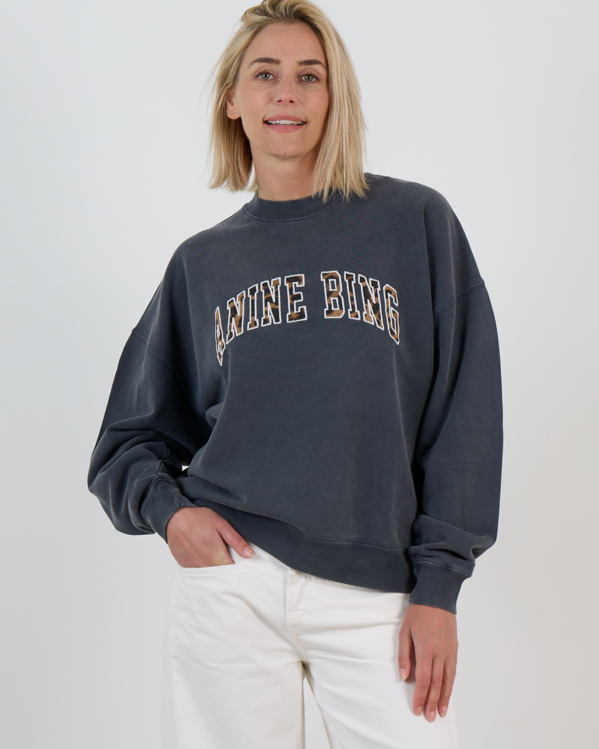This striking black sweater from Anine Bing features a bold leopard print logo embroidery across the front. The relaxed fit silhouette creates an elegant yet contemporary look, while the crew neckline and long sleeves offer timeless appeal. Crafted from 100% cotton, this women's clothing piece combines comfort with distinctive style. The rich black tone provides a sophisticated base for the eye-catching leopard motif detailing.
