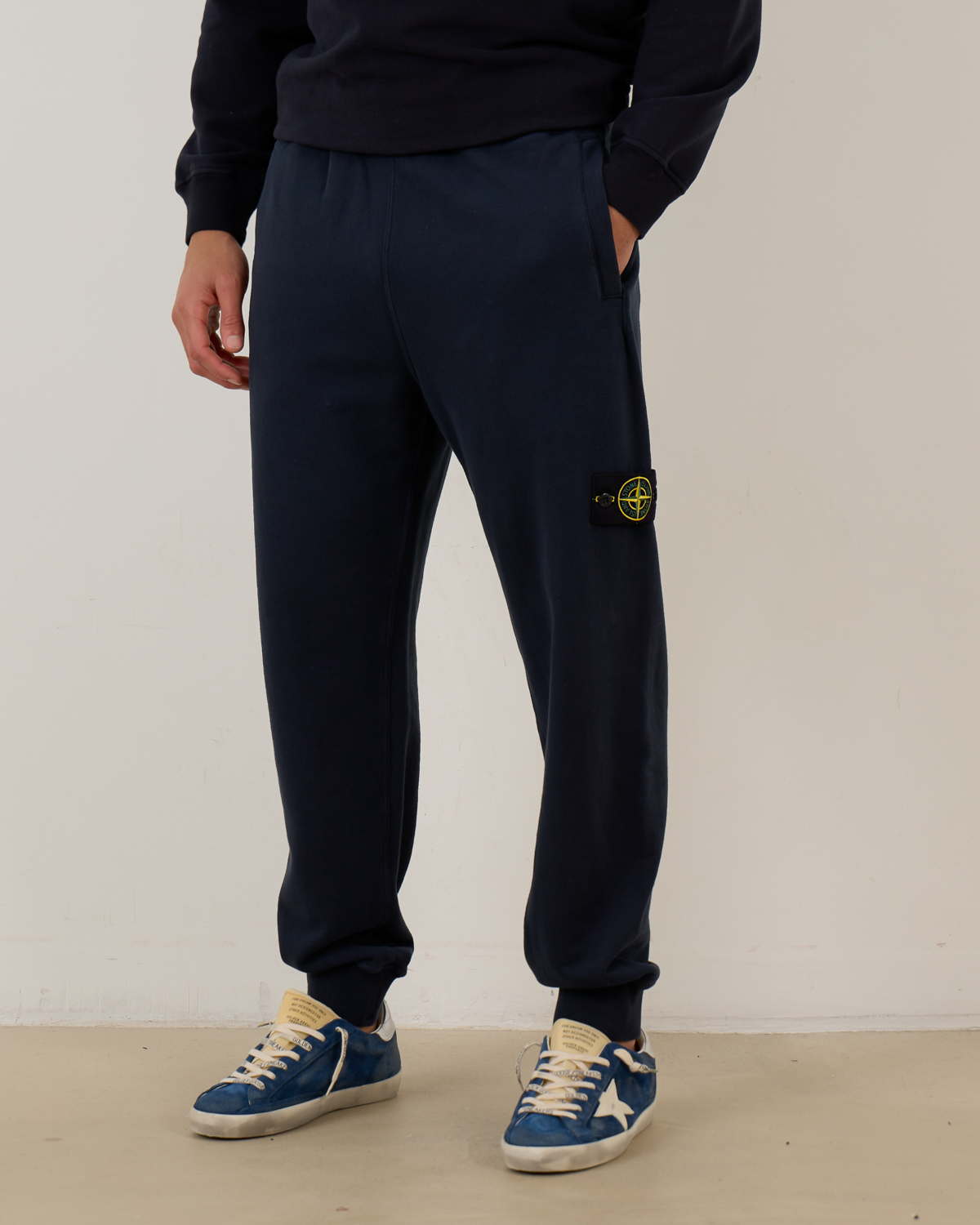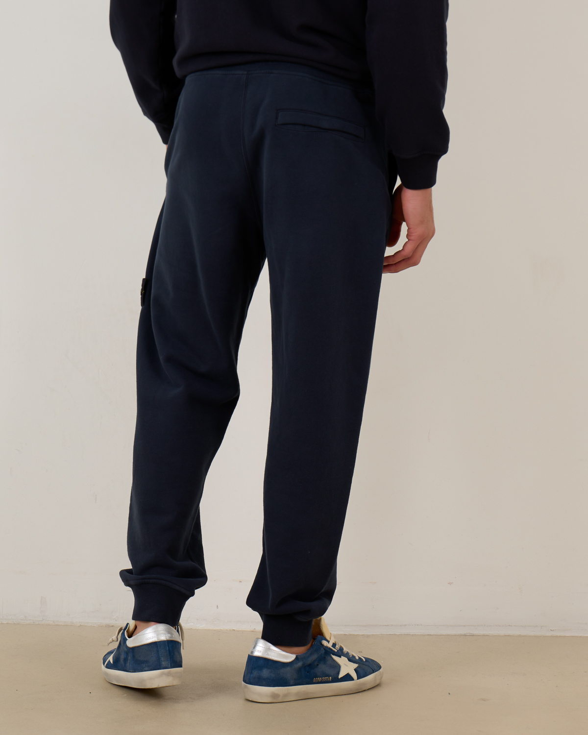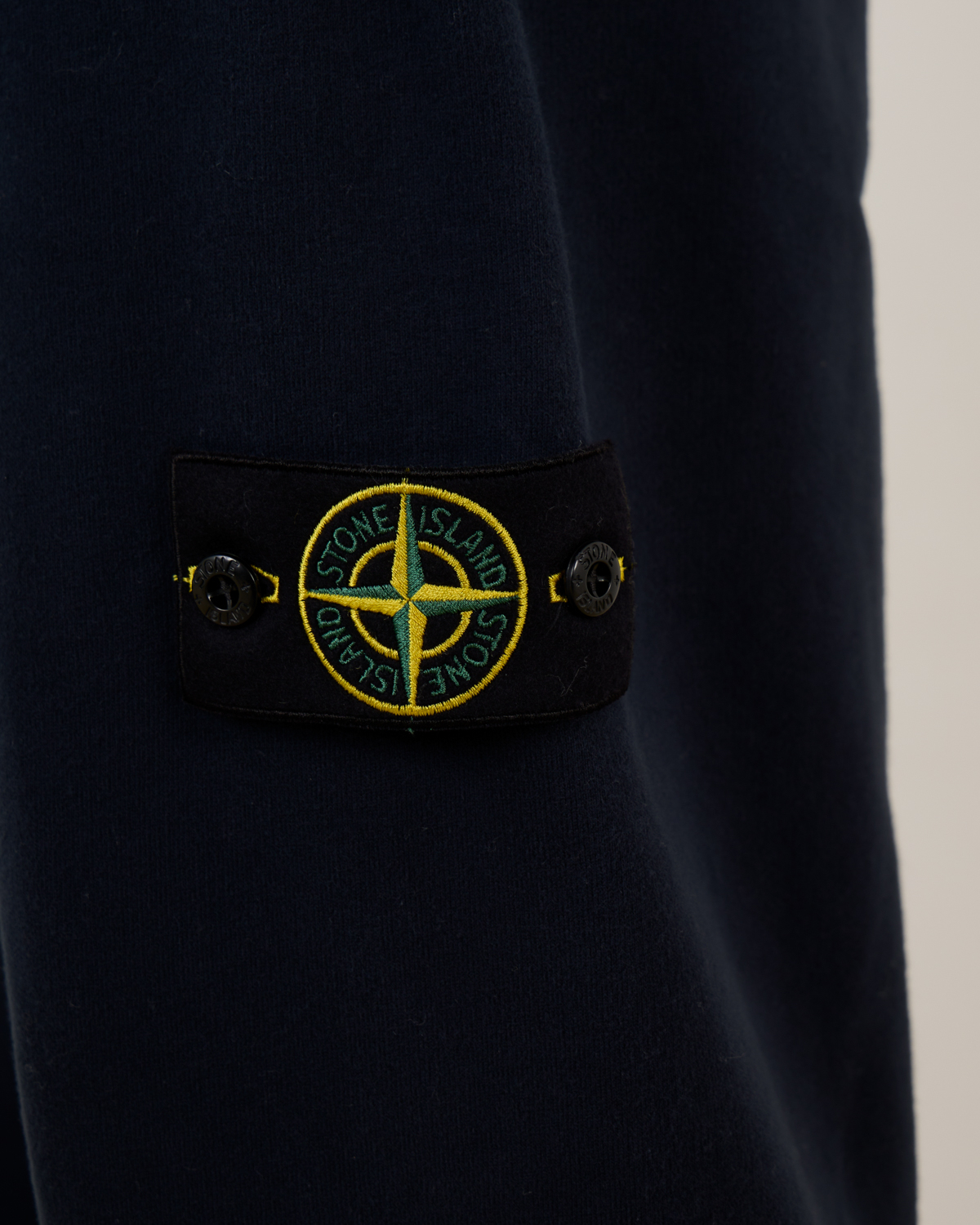 These navy sweatpants from Stone Island combine premium comfort with distinctive Italian design. Crafted from 100% cotton, the men's clothing piece features the iconic Stone Island compass logo embroidered on the left thigh in yellow and green tones. The regular fit offers natural movement while ribbed ankle cuffs create a tapered silhouette. Practical front pockets and a back pocket provide functional storage. The elastic waistband ensures comfortable all-day wear.