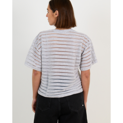 This contemporary striped jersey tee showcases refined women's clothing at its best. The grey base features textured brown and beige horizontal stripes that create visual depth and modern appeal. Crafted from a premium blend of 93% cotton, 6% polyamide, and 1% viscose, this short-sleeved piece offers exceptional comfort and breathability. The straight fit silhouette provides a relaxed yet polished look, while the round neckline adds classic elegance. The textured jersey fabric elevates this essential beyond basic casual wear.