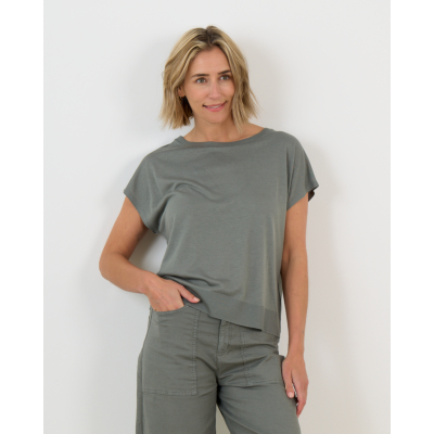 This green tee combines the best of contemporary women's clothing with refined comfort. Crafted from a premium lyocell-cotton blend (67% lyocell, 33% cotton), the fabric feels luxuriously soft against your skin while maintaining its shape beautifully. The regular fit silhouette features short sleeves and a classic round neckline with ribbed detailing that adds subtle texture. The sophisticated sage green shade brings versatility to your wardrobe rotation.