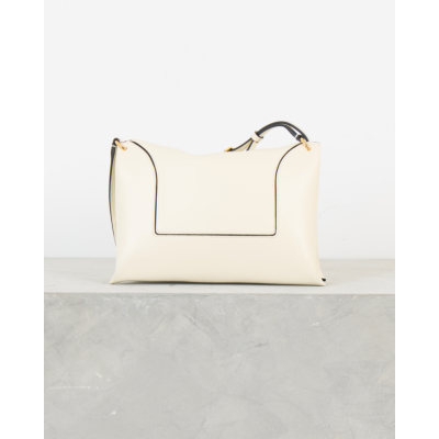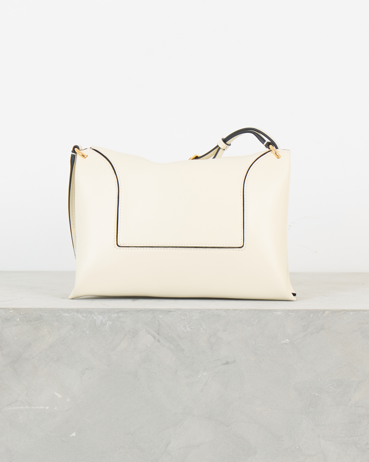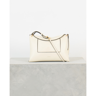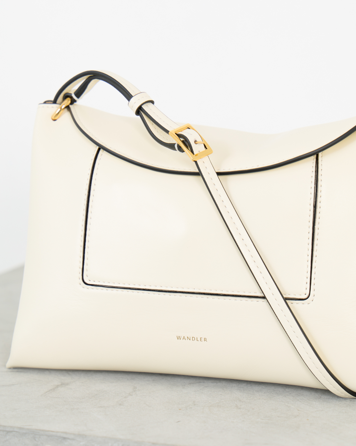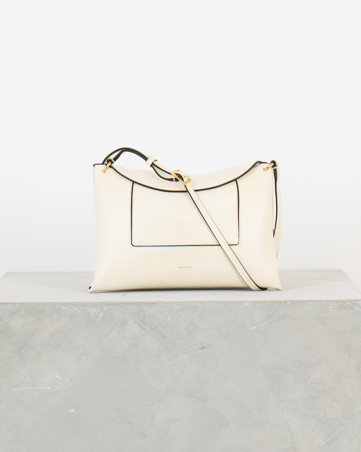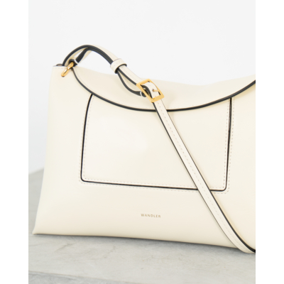 This refined cream leather handbag showcases Wandler's contemporary design aesthetic. The structured silhouette features clean lines enhanced by contrasting black piping details throughout. Gold-toned hardware adds luxurious accents, while the adjustable shoulder strap offers versatile carrying options. Crafted from premium leather in an elegant off-white shade, this women's clothing accessory combines minimalist sophistication with practical functionality.