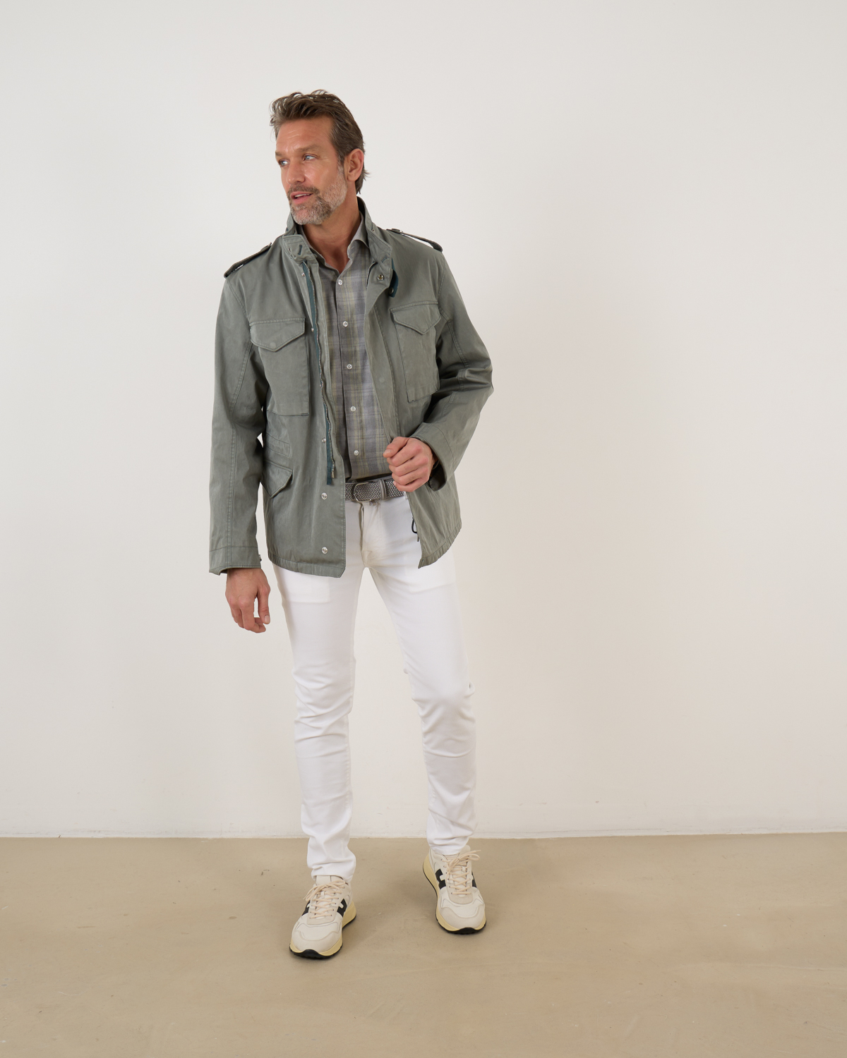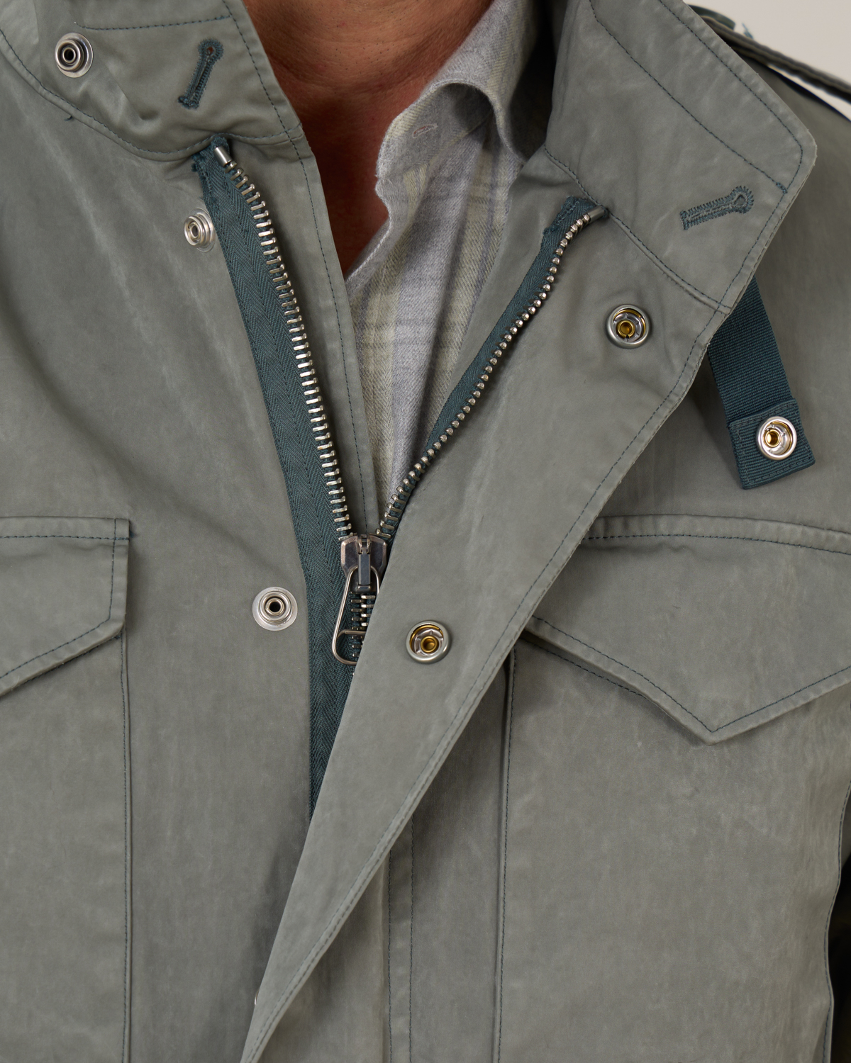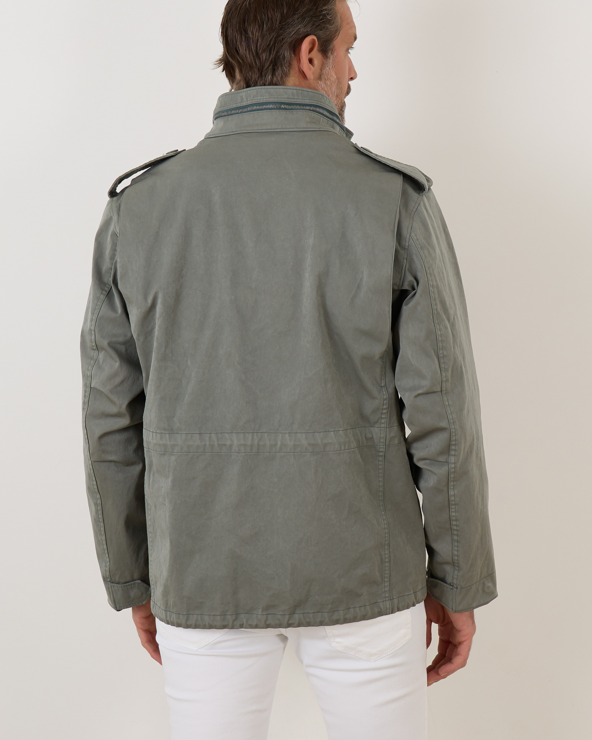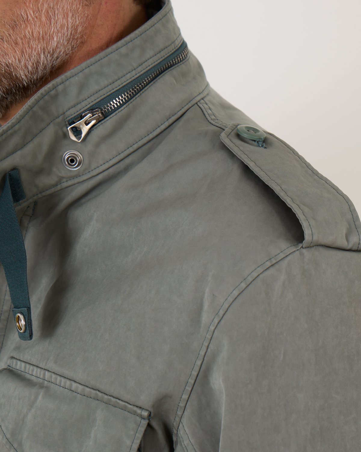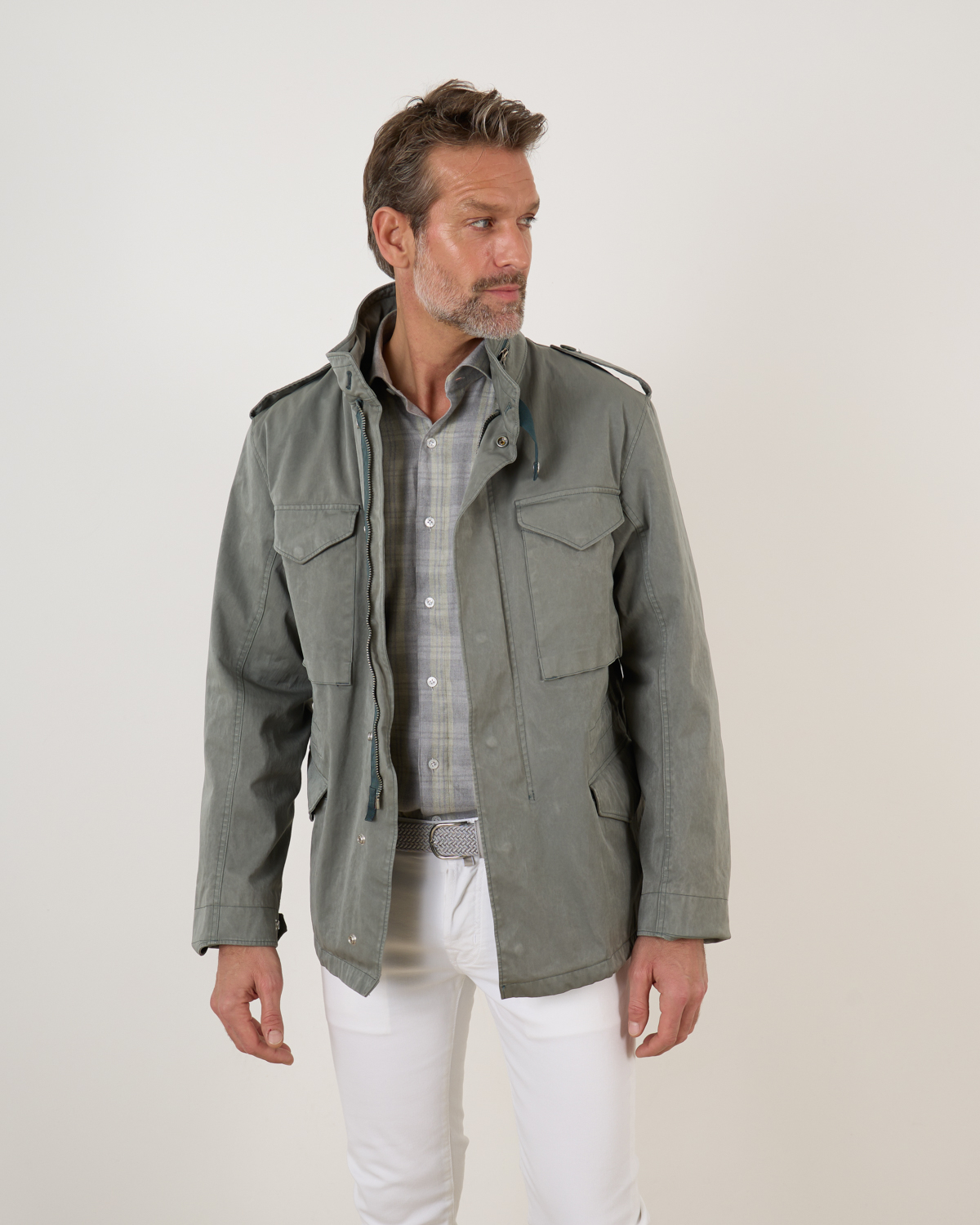 Field jacket van het merk Ten-C in de kleur foresst green. Het korte jack heeft aan de voorzijde opgestikte zakken met drukknopen en heeft verder een verborgen ritssluiting met drukknopen. Je kunt het jack combineren met de Down Liner van Ten-C. Doormiddel van knopen kun je de onderjas bevestigen. Zo heb je een zomer- en winterjas.