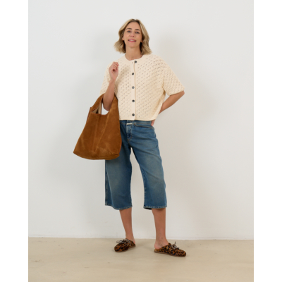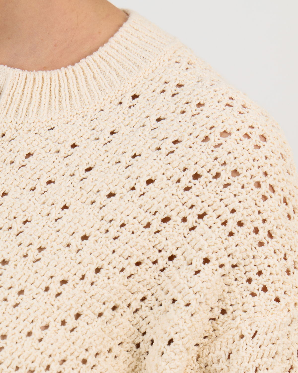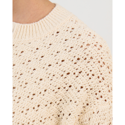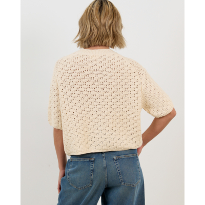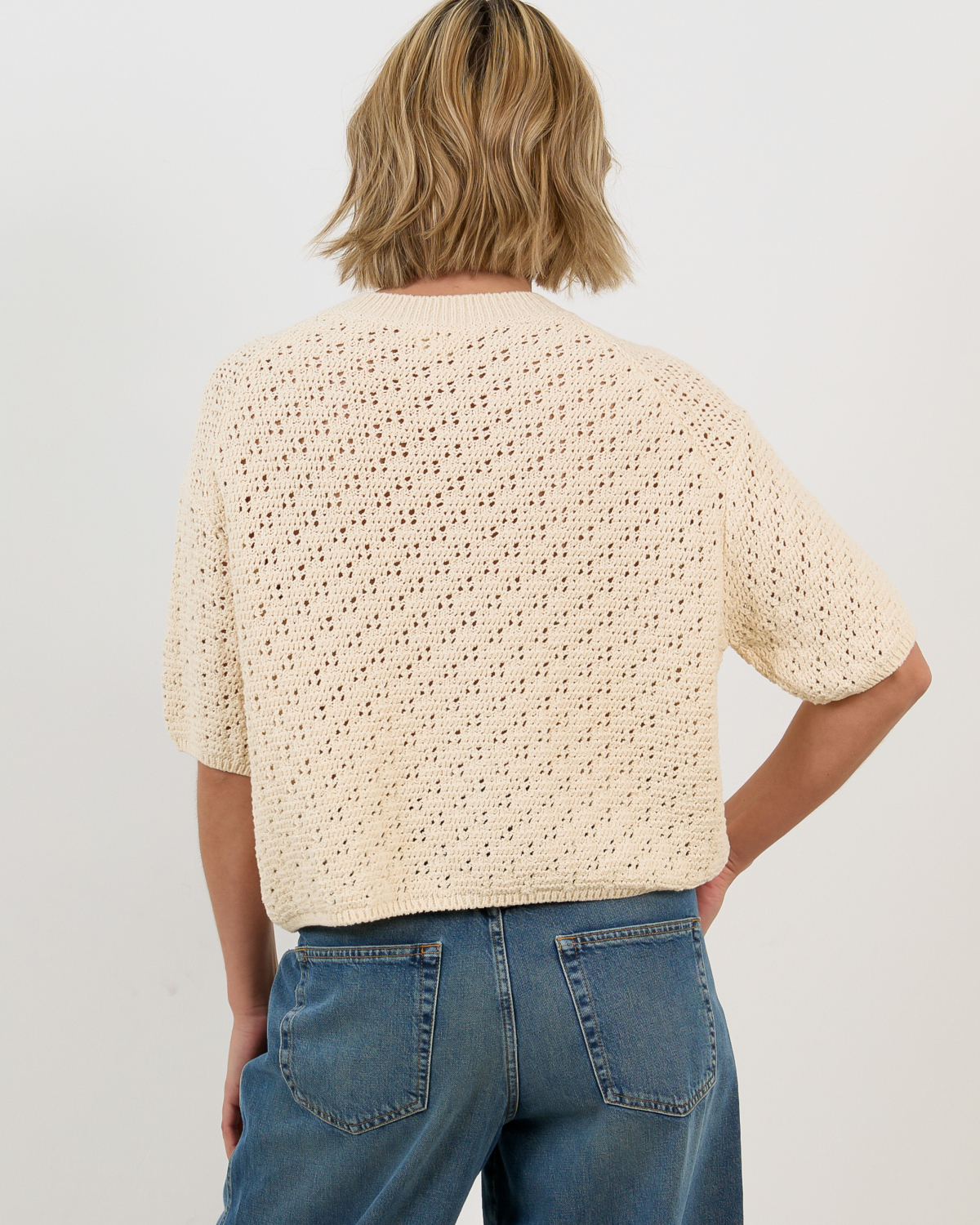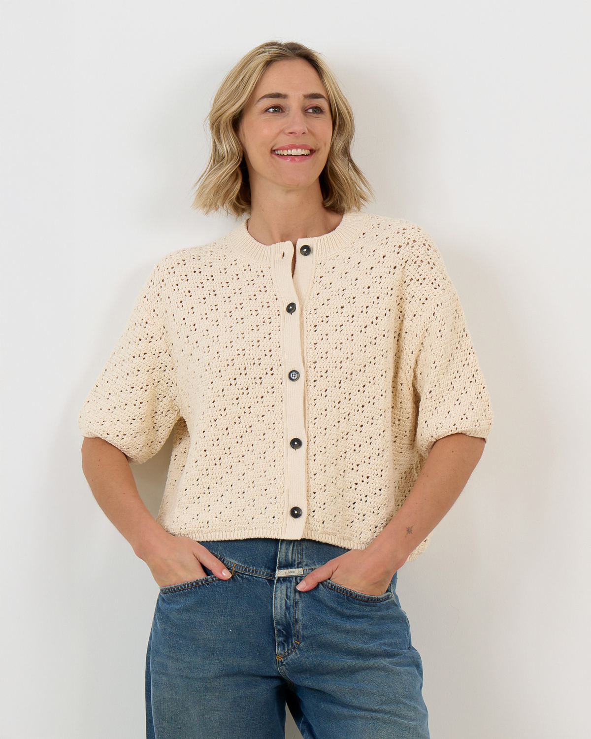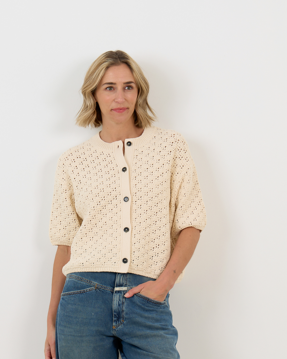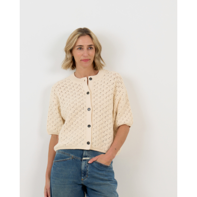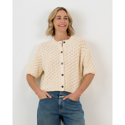 This crocheted cardigan in off white showcases an intricate open-knit pattern with contemporary appeal. The half sleeves and cropped silhouette create a modern, relaxed fit that works beautifully for layering. Crafted from a blend of 51% recycled cotton, 34% cotton, and 15% polyamide, this women's clothing piece combines comfort with style. The round neckline and button-front closure add classic cardigan details, while the airy crochet texture brings visual interest to any outfit.