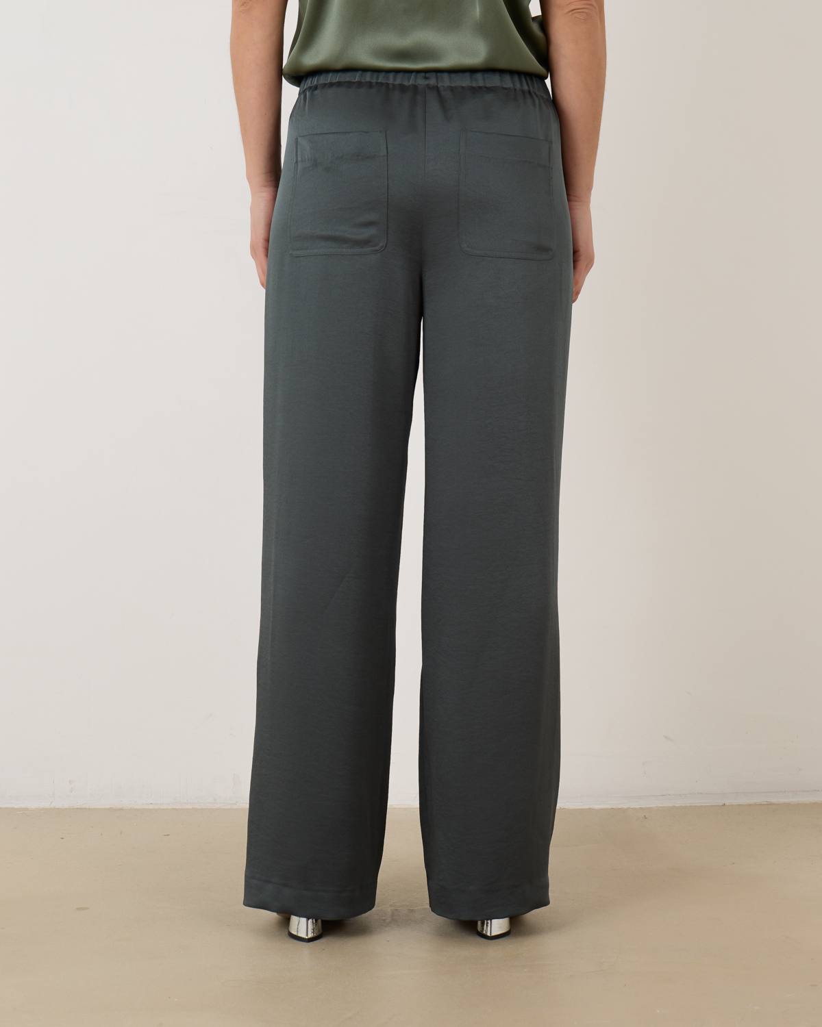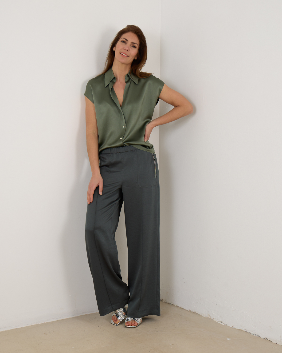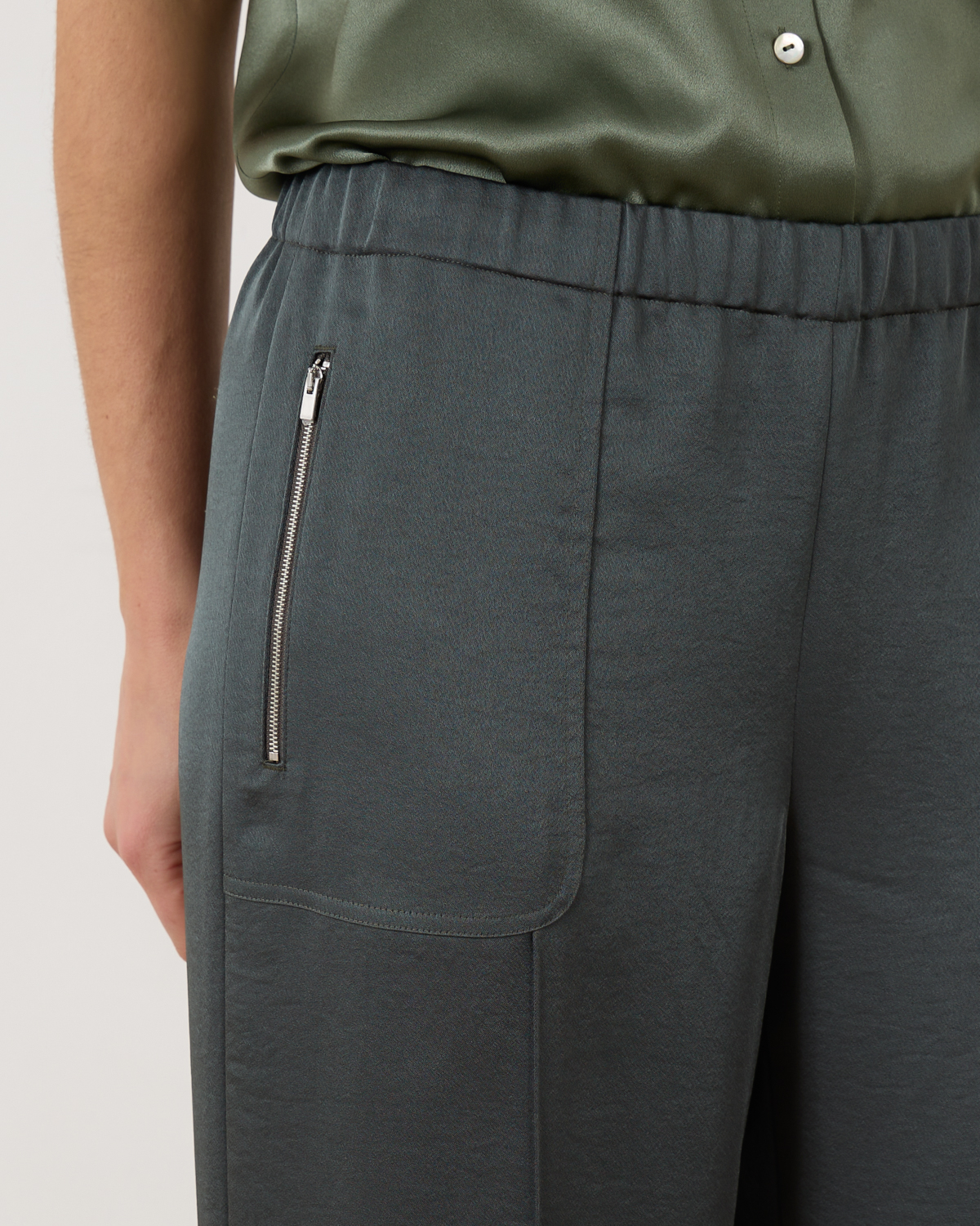Ontdek deze wide-leg stijl van Vince. De pantalon met wijde pijpen komt in de kleur Night Pine en heeft een satijnen-afwerking. Deze mooie glans wordt versterkt door de steekzakken met ritssluiting en elastische tailleband om zo het design compleet te maken.