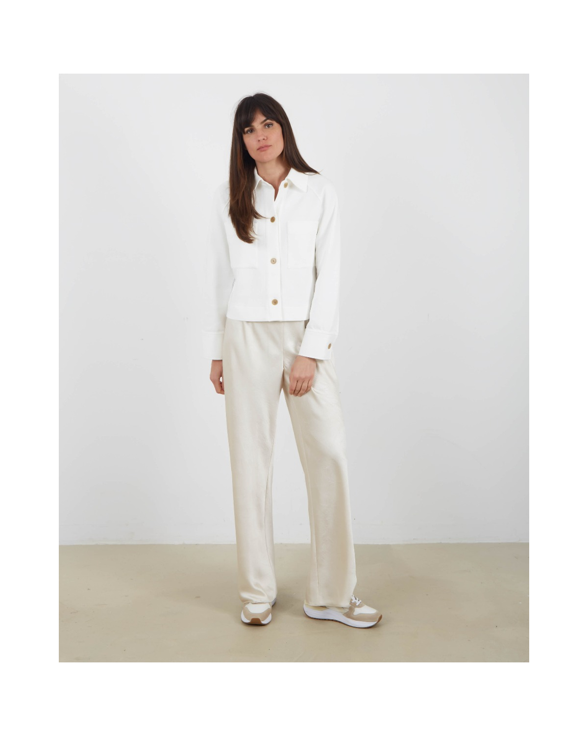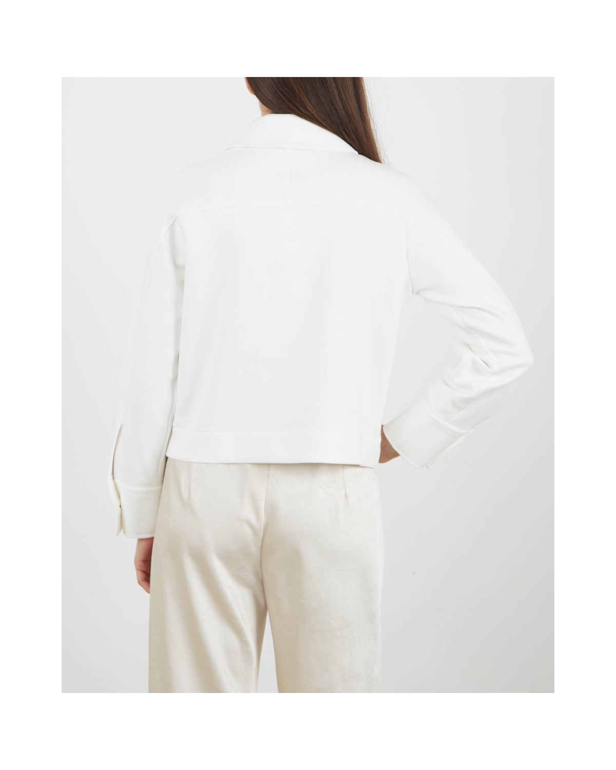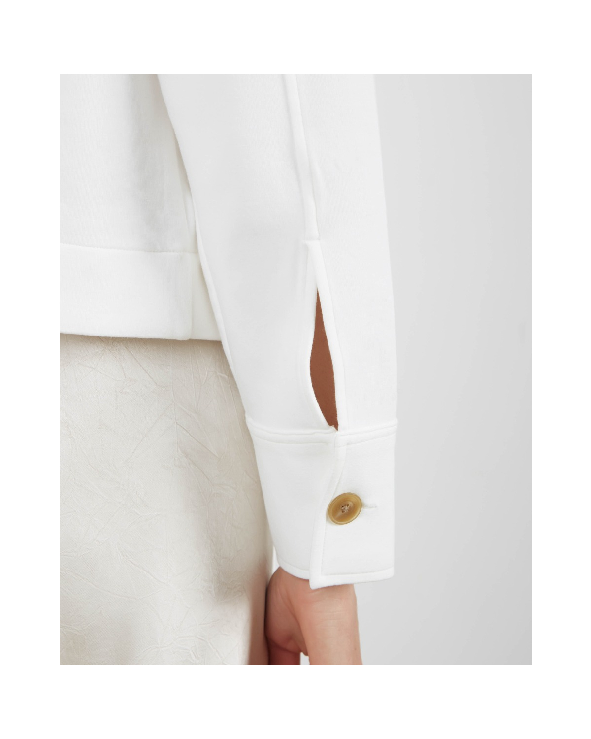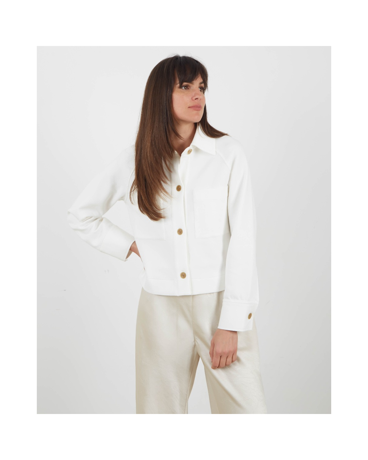 Lightweight short Jacket from Vince is a layering shirt in the color off white. The shirt jacket is made of a cotton blend jersey with extra stretch. Furthermore, the jacket is finished with patch pockets, a button closure and a pointed shirt collar. The shirt jacket can be worn buttoned up as a shirt or unbuttoned as a lightweight jacket.