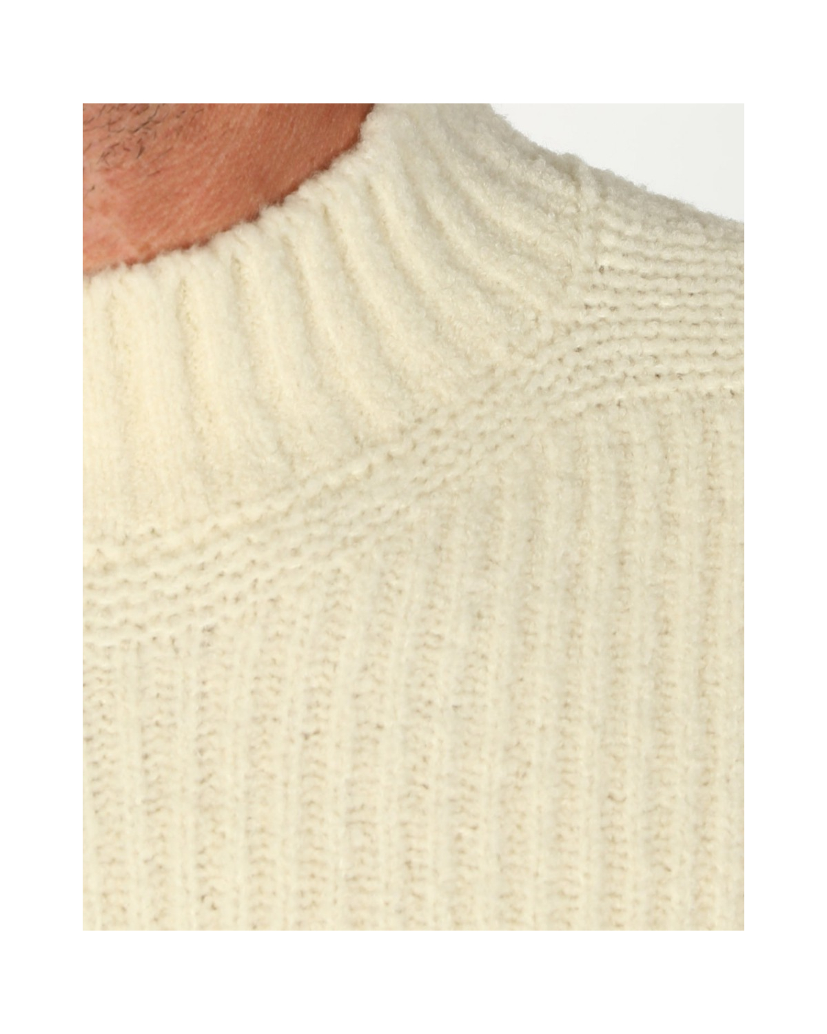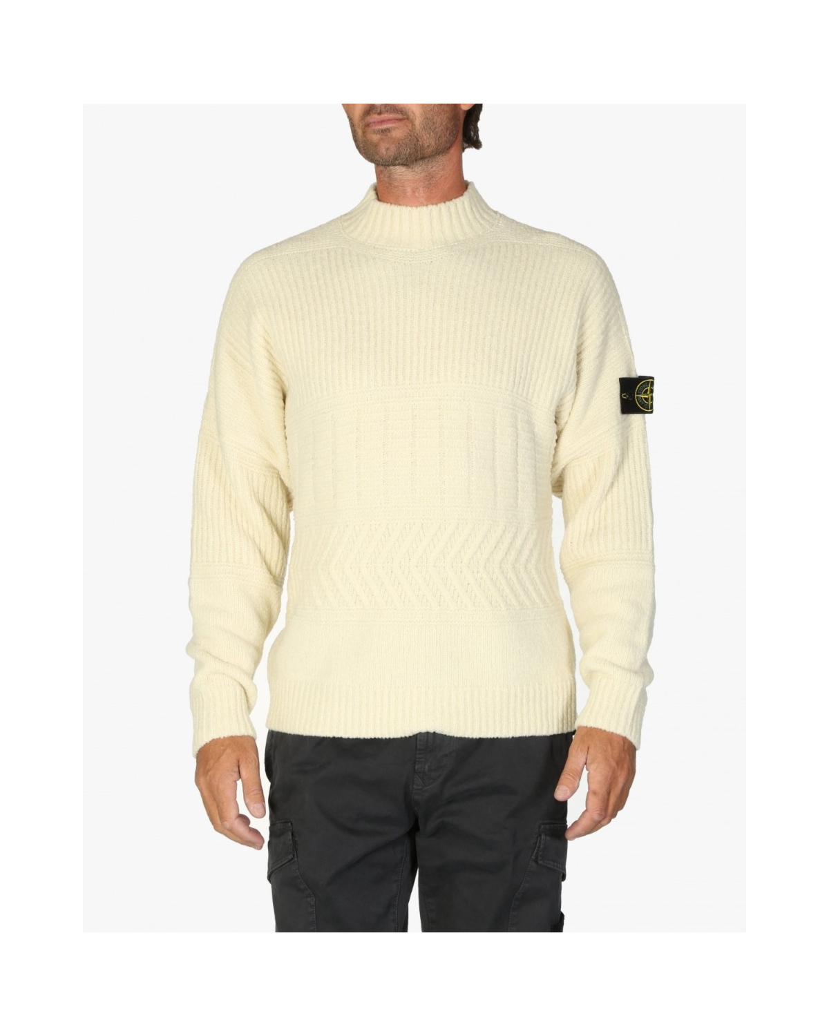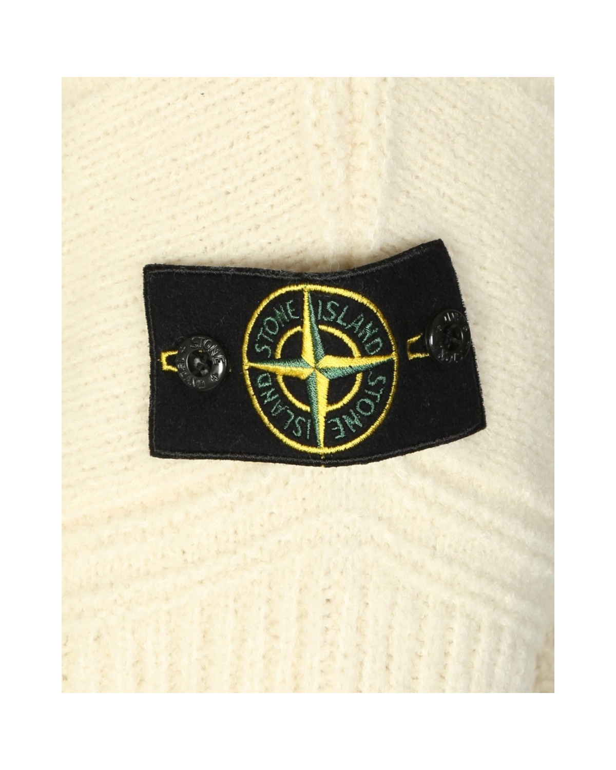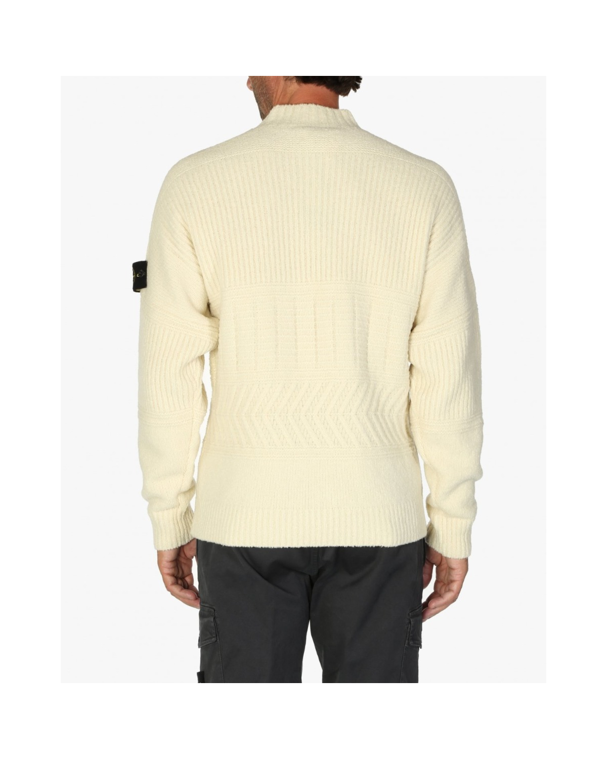 White woolen sweater from the Stone Island brand. The sweater has knitted in different patterns and has an oversized fit. The sweater has a Stone Island logo on the left sleeve.